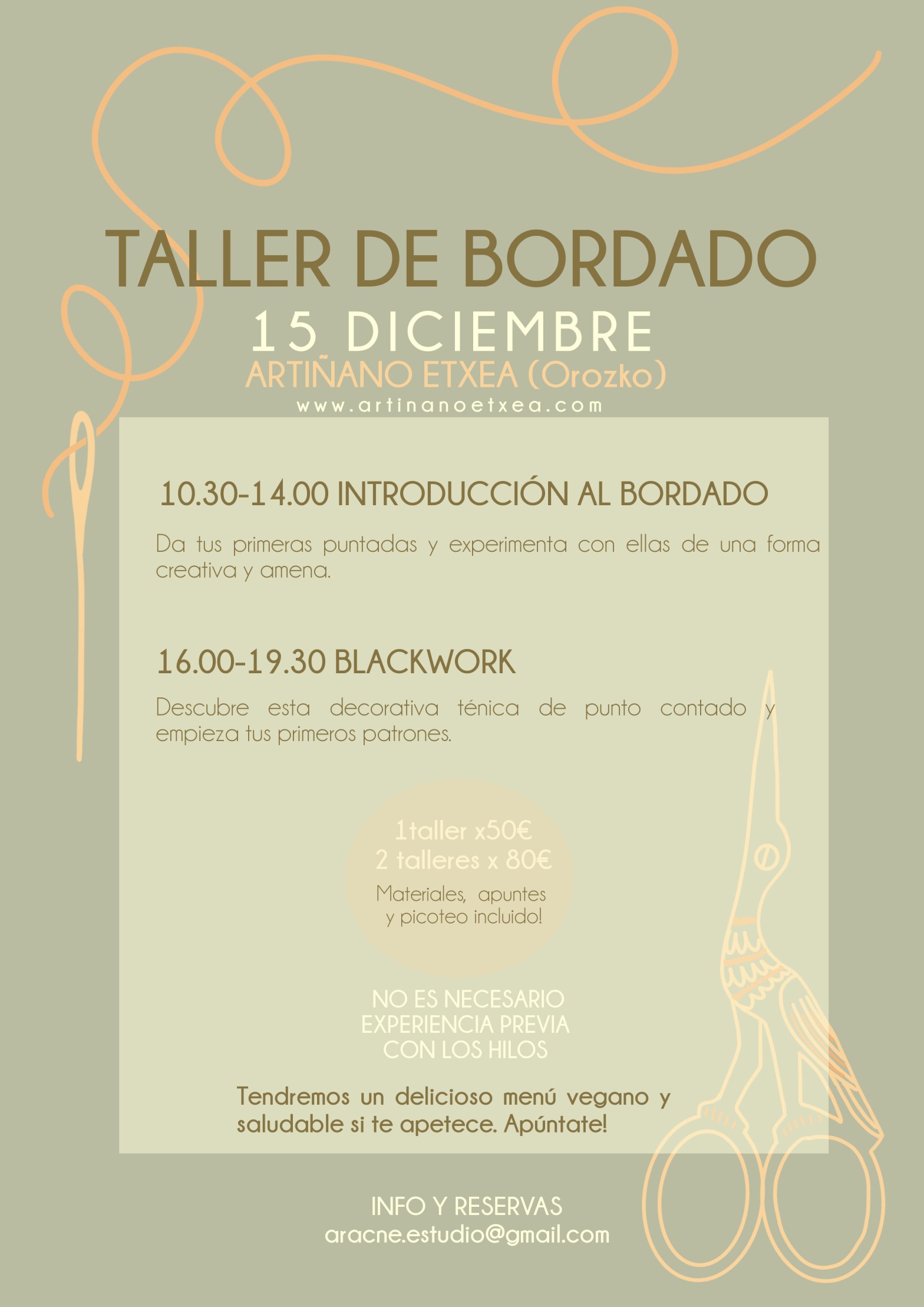 TALLERES DE BORDADO EN ARTIÑANO ETXEA (Orozko) 15 de Diciembre 2019 10,30-14,00: Iniciación al Bordado 16,00-19,30: Blackwork En Aracne queremos terminar el año con un bonito día de talleres en Artiñano Etxea, una preciosa casa rural en Orozko, a las faldas del monte Gorbea. El bordado es una antigua labor que en estos últimos añosSigue leyendo «TALLERES DE BORDADO EN ARTIÑANO ETXEA»